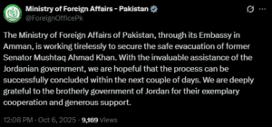 In a statement, the FO said Pakistan’s embassy in Amman is coordinating closely with Jordanian authorities to secure Khan’s release. “With the invaluable assistance of the Jordanian government, we are hopeful that the process can be successfully concluded within the next couple of days,” the ministry noted, while also expressing gratitude to Jordan for its “exemplary cooperation and generous support.”