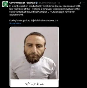 Islamabad: In a joint counterterrorism operation, the Intelligence Bureau Division and the Counter-Terrorism Department (CTD) have apprehended four individuals linked to the suicide bombing at the Judicial Complex in Sector G-11, Islamabad.